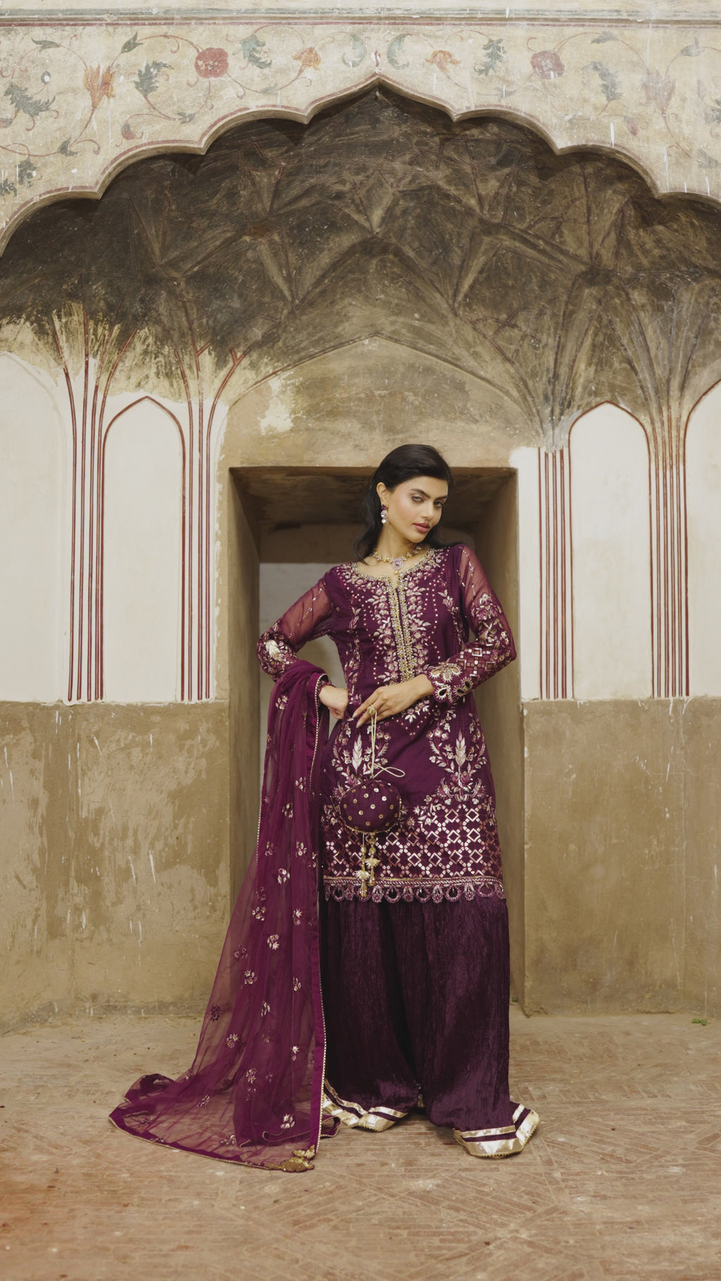• Sharara: Crushed silk sharara, detailed with gota border.
