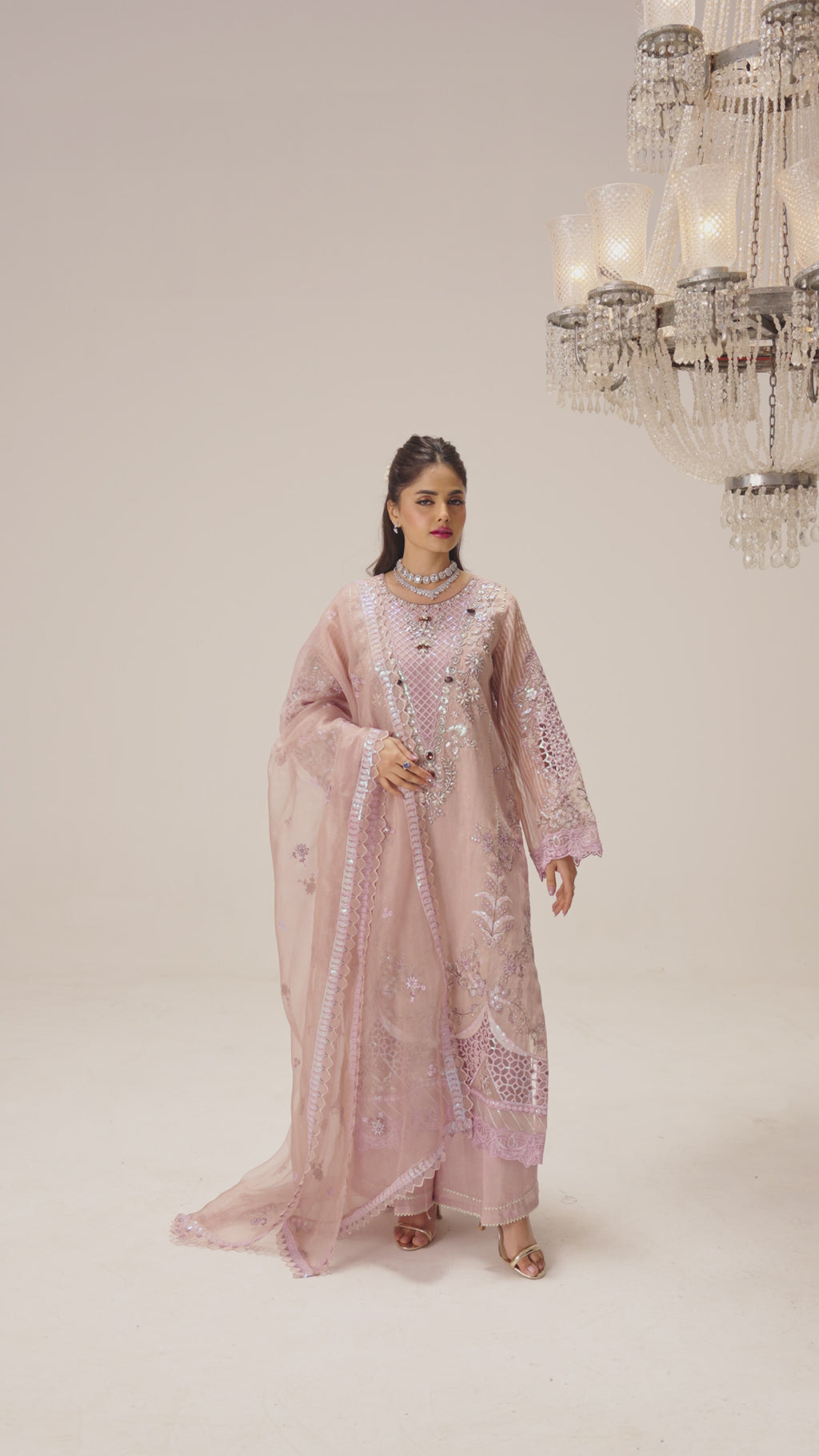 • Daman & Sleeves: Designed with elegant cutwork motifs and embroidered borders.