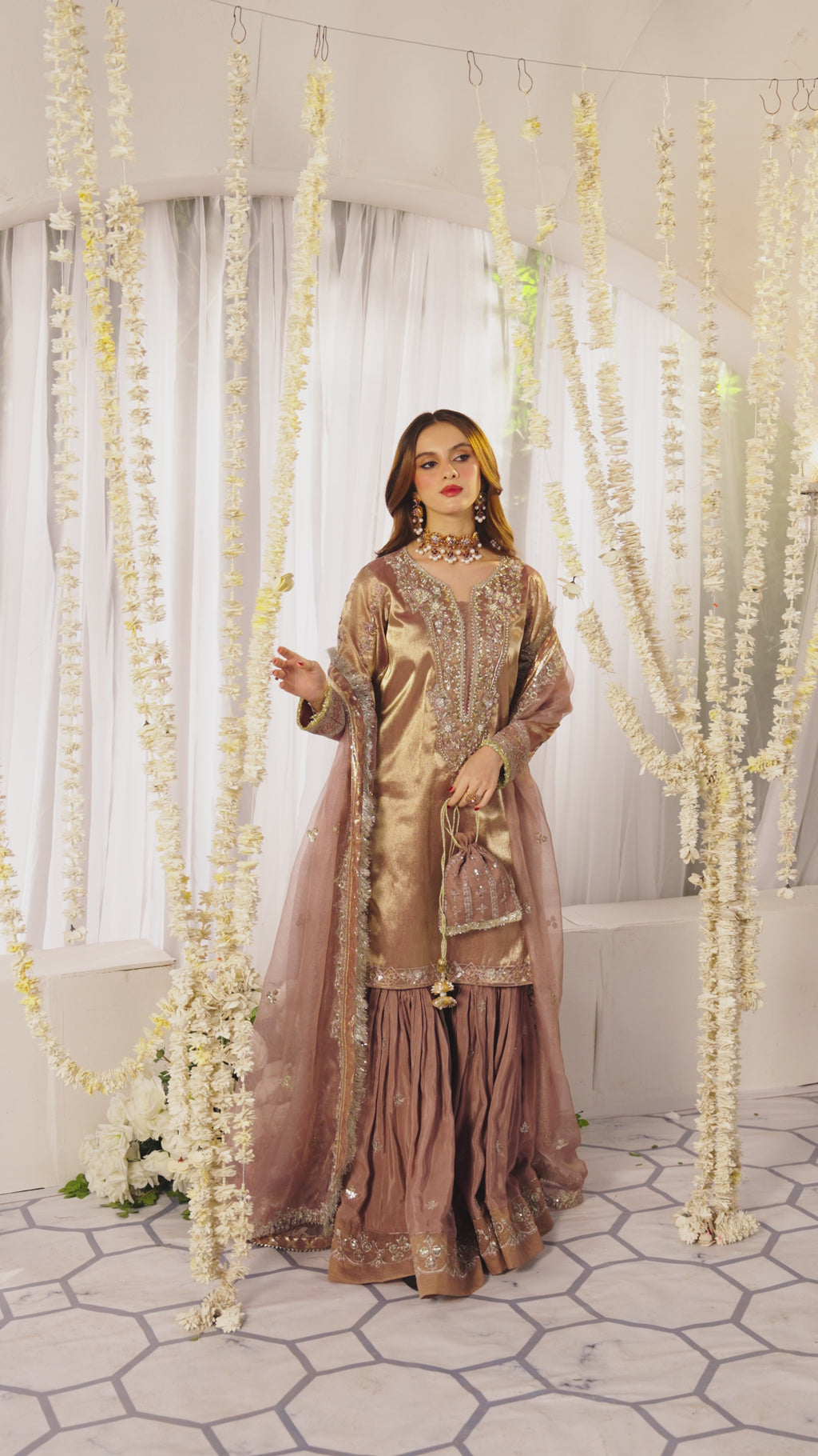 • Gharara: Sequin and resham embroidered gharara, finished with an elegant embroidered border.